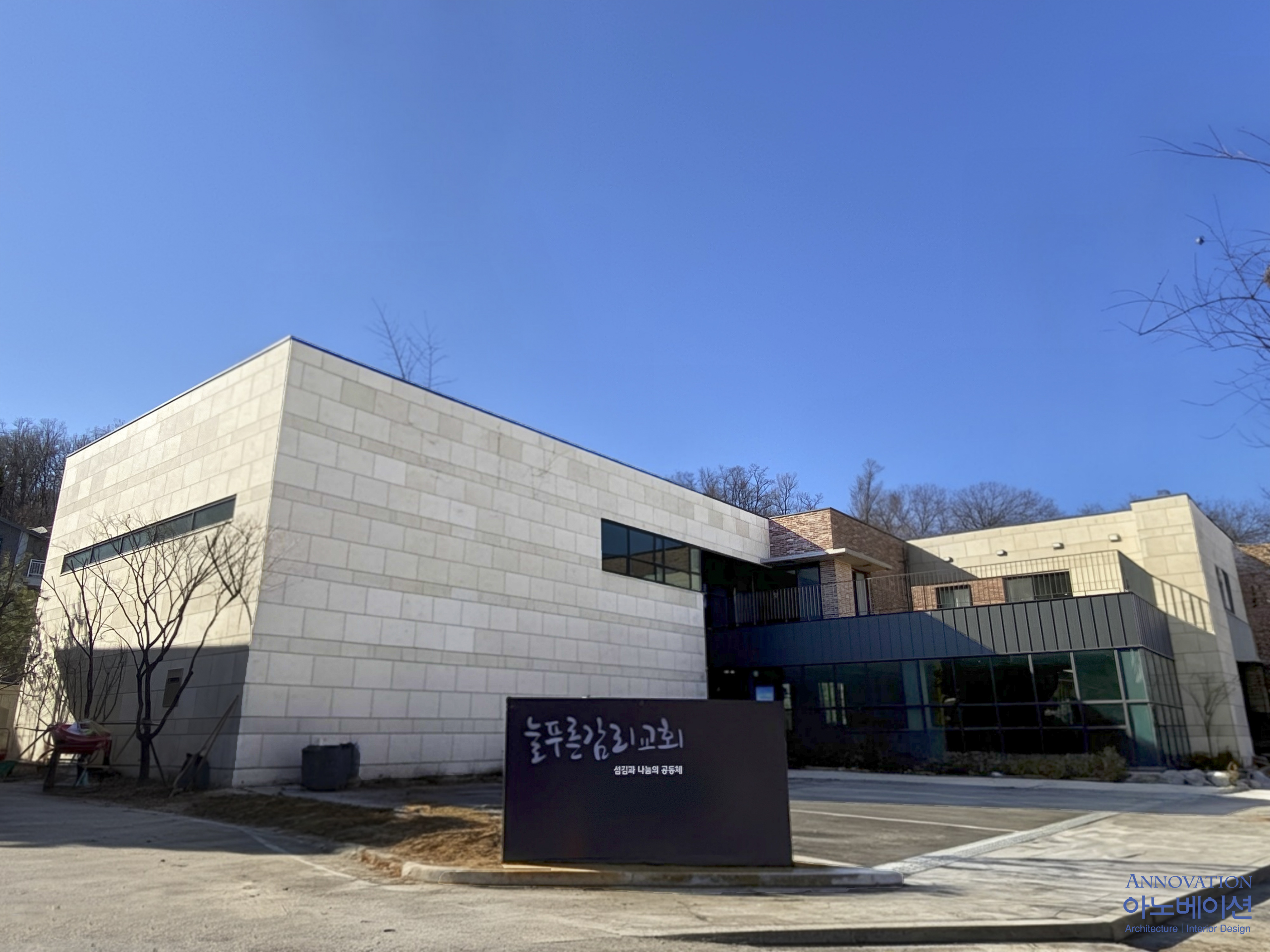 완성된 교회는 이스라엘 라임스톤의 은은한 색감과 리얼징크판넬의 모던함, 그리고 모노블릭벽돌의 따뜻함이 어우러져 주변 자연환경과 조화를 이루는 모습입니다. 과거 경사지였던 대지는 옹벽 구조물로 안정감을 확보하고, 효율적인 우수 배수 시스템을 통해 쾌적한 환경을 유지하게 되었습니다. 로비 상부의 오픈 브릿지는 탁 트인 개방감을 선사하며, 내부 공간에 특별한 분위기를 더합니다.